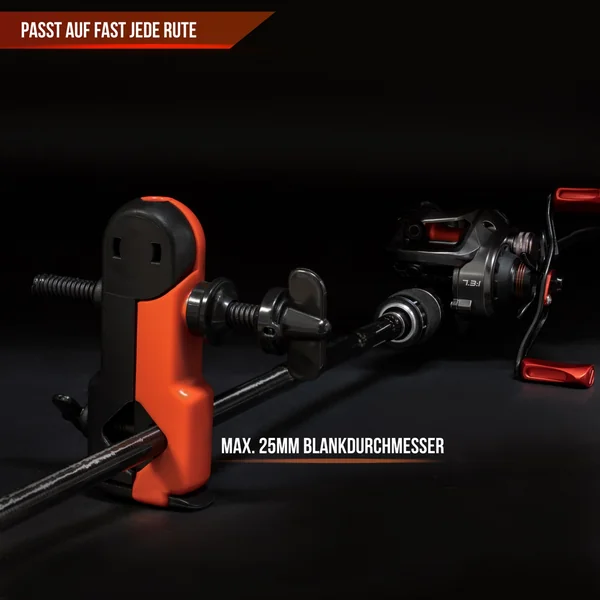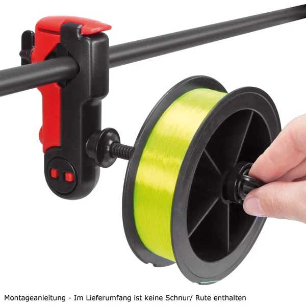 Klemmen Sie die Station einfach auf den Blank Ihrer Angelrute und befestigen die Spule mit leichtem Druck auf der Achse. So kommt die Schnur in gleich bleibender Spannung von der Spule und wickelt sich optimal mit der Schnurverlegung der Rolle auf die Spule.