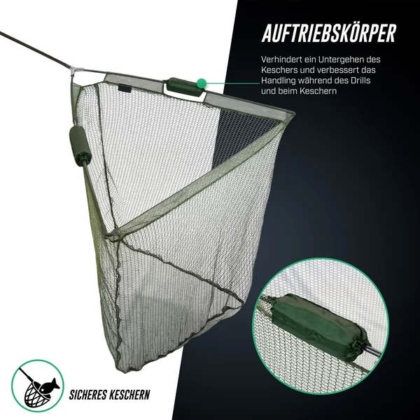 Und auch ohne Hilfe Fischen ist mit diesem Kescher spielend möglich, da Sie den Kescher auch mit einer Hand bedienen können, wenn die Rute noch gehalten werden muss. Die beiden Netfloats an den Kescherkopfarmen stützenden Kopf beim einkäschern auf der Wasseroberfläche, damit er nicht abtaucht.