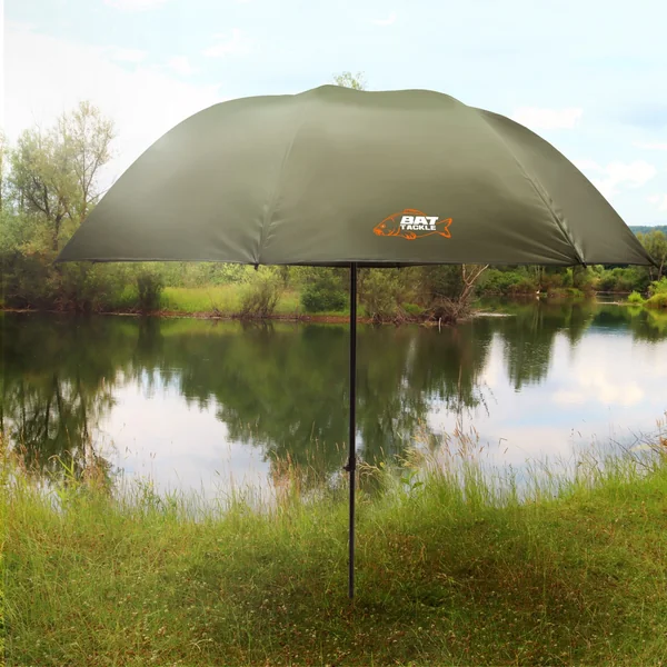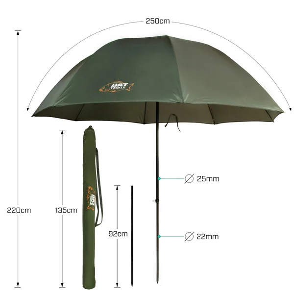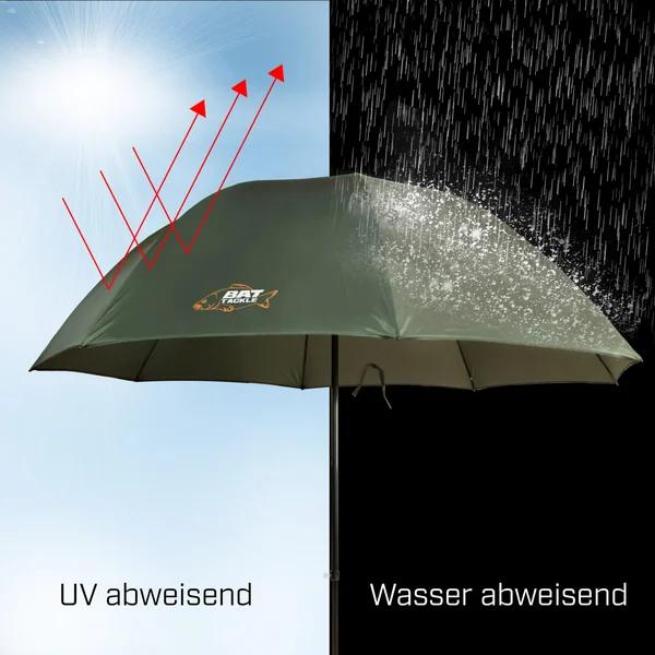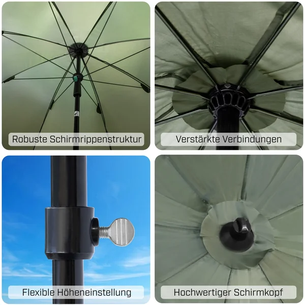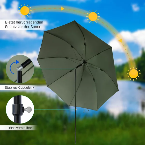 Bei dem RX Angelschirm handelt es sich um einen olivgrünen Schirm mit einer schwarz lackierten Schirmstange. Die Mittelstange hat im Schirmkopf ein Gewinde und kann um 45° abgewinkelt werden. Hierzu wird die Mittelstange einfach durch drehen am Gewinde gelöst angewinkelt und im 45° Winkel wieder festgeschraubt. Die Mittelstange ist zweiteilig aus Aluminium und die Standhöhe kann so angepasst werden, die dann mittels einer Schraube fixiert wird. Die Stange ist am unteren Abschluss gespitzt und erleichtet so das Einbringen in den Boden.