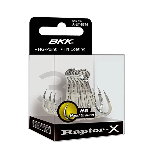 Der Raptor-X ist ein 3X-gehärteter Drillingshaken, dessen Design von einem der besten Drillingshaken inspiriert ist, die BKK jemals auf den Markt gebracht hat: dem Raptor-Z. Die Proportionen zwischen Hakenspalt und Schaft werden beibehalten, um den Raptor-X mit einer hervorragenden Haltekraft auszustatten. Die Hakenspitze wird jedoch leicht begradigt, um die Verbindungsrate zu verbessern. Dies wird durch das schlankere Profil des Drahtes und die Hand-Ground-Verarbeitung ermöglicht. Der Raptor-X verfügt über einen leichteren Draht und ist auch in sehr kleinen Größen erhältlich. Er eignet sich zum Austatten kleinerer Köder, ohne deren Laufeigenschaften zu beeinträchtigen. Die Leichtigkeit der Hakenstruktur wird auch durch die Hand-Ground-Verarbeitung erhöht, durch die der Haken manuell geschärft wird, indem Material um die Spitze entfernt wird. Die Bright-Tin-Beschichtung des Raptor-X zielt darauf ab, seine Leistung in Bezug auf die Korrosionsbeständigkeit von Salzwasser zu maximieren und ist somit auch für raue Salzwasserumgebungen geeignet.