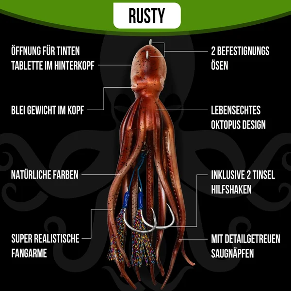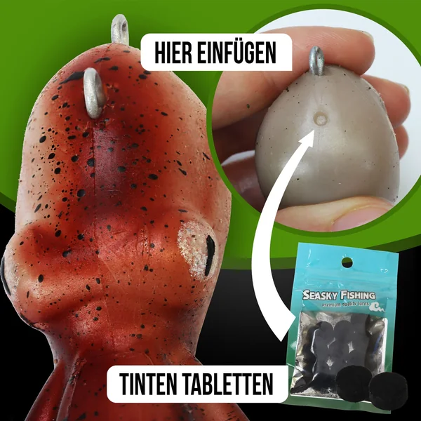 Um den lebensechten Charakter des Oktopus Teasers noch weiter zu verbessern, haben wir spezielle Tintentabletten entwickelt, die in den Kopf des Köders gesteckt werden. Diese Tintentabletten produzieren unter Wasser realistische Tintenwolken und verstärken den Effekt des natürlichen Beuteverhaltens. Die Tintenwolken ziehen die Aufmerksamkeit der Fische auf den Köder und steigern somit die Fangchancen erheblich. Mit dem Oktopus Teaser sind Sie der Natur so nah wie nie zuvor!