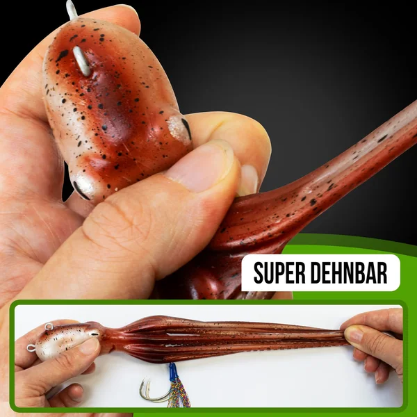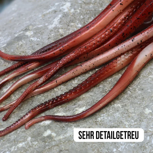 Der Oktopus Teaser zeichnet sich durch das verführerische Spiel seiner super-weichen Tentakeln aus. Diese erstaunliche Eigenschaft aktiviert alle Sinneswahrnehmungen und Reize des Welses sowie anderer Meeresfische. Das subtile und dennoch lebendige Bewegungsmuster ahmt perfekt eine Reihe von Beuteobjekten nach, wie z.B. Wurmbündel, Calamari oder den Oktopus selbst. Mit dem Oktopus Teaser haben Sie einen Köder in der Hand, der die natürliche Beute imitiert und die Aufmerksamkeit der Fische garantiert auf sich zieht.