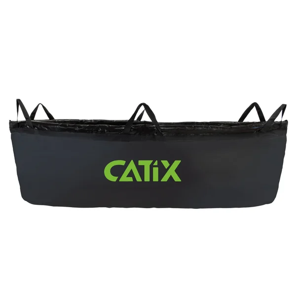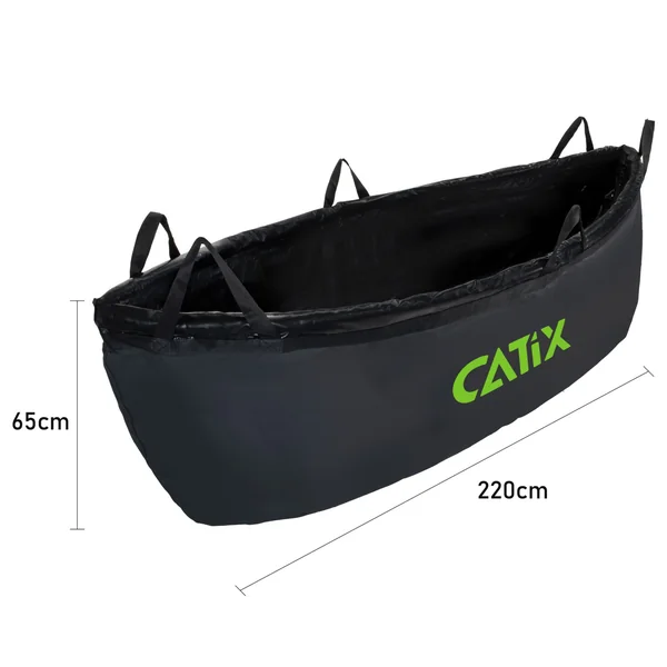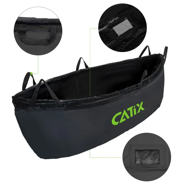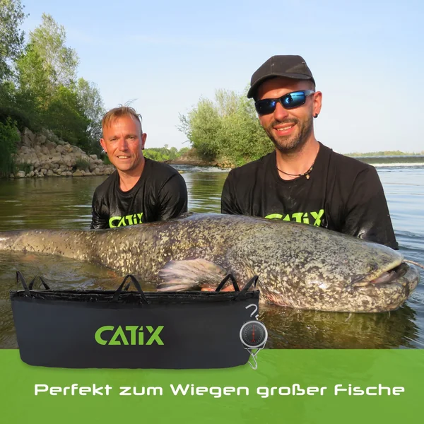 Die Spezial-Wiege- und Transport-Matte für Welsangler. Sechs Trageösen ermöglichen einen sicheren und fischschonenden Transport von Großwelsen in unwegsamem Gelände. Der Fisch liegt sicher und vor dem Herausrutschen geschützt in der Transporttasche und kann von zwei Anglern getragen werden. Die Catix Weigh Sling eignet sich sehr zuverlässig, um Fische der 100-Kilo-Klasse schonend und schnell zu wiegen. Spezielle Wasserabläufe aus Schleimhaut schonendem Netzmaterial sind an der Unterseite der Matte eingenäht. Besonders Bootsangler können in der Weigh Sling den Fisch direkt an Bord versorgen und das Bootsinnere vor Dreck und Schleim schützen.