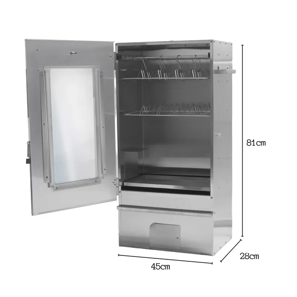 Der neue Eversmoke Räucherofen aus galvanisiertem Stahl vereint Funktionalität, Langlebigkeit und modernes Design. Dank der großen Sichtscheibe behalten Sie Ihr Räuchergut stets im Blick – vom ersten Glimmen des Räuchermehls bis zum perfekten Garpunkt. Ausgestattet mit einem präzisen, montierbaren Thermometer und einem Lüftungsschieber an der Oberseite lässt sich die Temperatur und Luftzufuhr optimal steuern – für gleichmäßige Ergebnisse bei Fisch, Fleisch, Wurst oder Käse. Die Räucherkammer mit den Maßen 38,5 × 26,5 × 56,5 cm bietet reichlich Platz für verschiedenste Räucherwaren. Im Lieferumfang enthalten sind: 3 Stangen mit 12 Räucherhaken zum Aufhängen, 2 Fischkörbe zum Legen, ein Tropfblech für sauberes Räuchern, eine Räuchermehlschale und eine Feuerschale für den klassischen Betrieb mit Holz oder Holzkohle. Der Ofen kann wahlweise auch mit einem Gasbrenner oder einer Elektroheizung (dank integriertem Hitzeschutz mit Aussparung) betrieben werden – ideal für flexible Nutzung auf Terrasse, Balkon oder im Garten. Mit den seitlichen Tragegriffen lässt sich der Räucherofen sicher transportieren und einfach positionieren. Eversmoke – für authentischen Räuchergenuss mit Stil, Präzision und Vielseitigkeit.