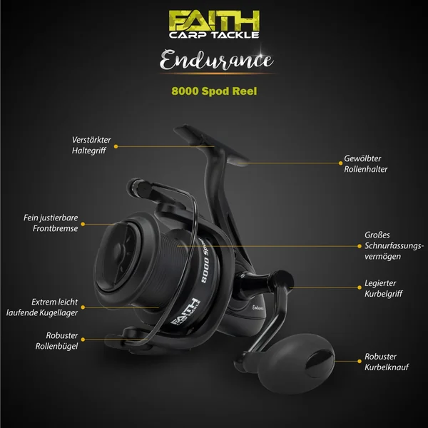 Durch die tollen Eigenschaften und Feinheiten der Faith Endurance 8000 Spod werfen Sie Ihren persönlichen Angel Hotspot immer wieder gezielt und akkurat an. Zum Lieferumfang gehört ebenfalls eine zweite Spule aus Aluminium. Mit der Faith Endurance 8000 Spod Big Pit Rolle können Sie problemlos auf Großfische und Karpfen fischen. Die Endurance bietet alles zu einem hervorragenden Preis.
