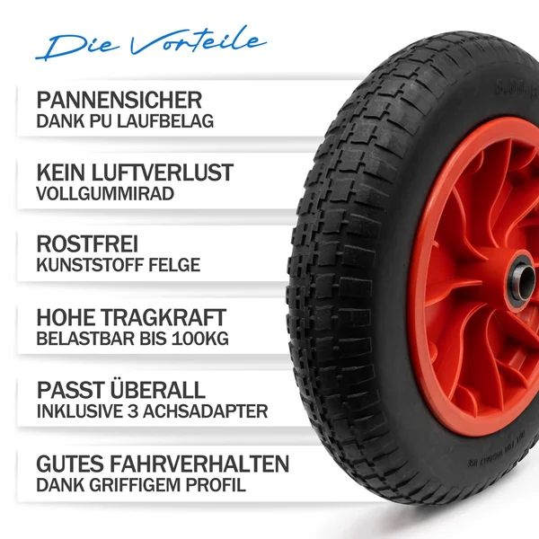 Vergessen Sie platten Reifen und ständiges Nachpumpen – dieses hochwertige Schubkarrenrad sorgt dauerhaft für Mobilität im Garten. Der geschäumte Polyurethan-Laufbelag ist absolut pannensicher und trotzt Dornen, Nägeln oder langen Standzeiten ohne Luftverlust. Ideal für alle, die ihre Gartenschubkarre zuverlässig und ohne Aufwand nutzen möchten. Die rostfreie Kunststoff-Felge mit leichtgängigem Kugellager (Ø 25mm) sorgt für ein ruhiges Laufverhalten und Langlebigkeit. Mit einer Tragkraft von 100kg und den Maßen 338×68mm (Breite: 81mm) passt es auf alle gängigen Schub- und Sackkarren. Dank 3 beiliegender Achsadapter ist es schnell montiert.
