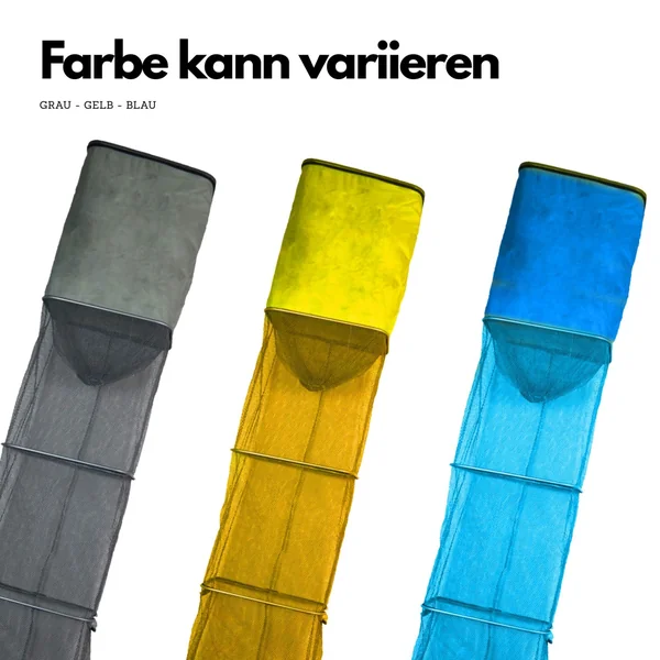 Die Form des Keschers ist rund und sehr lang, so dass er ins Wasser ausgelegt werden kann und so dem Fisch einen geschlossenen Raum zum schwimmen bietet.