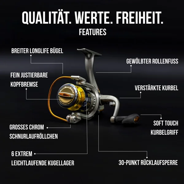 Der Schnurfangbügel der High Cast Stationärrolle ist mit einer Longlife Bügelfeder versehen, extra dick designed und weist ein großes Schnurlaufröllchen auf. Die Kurbel kann für Links- bzw. Rechtshandbetrieb umgesteckt werden. Eine 30-Punkt Rücklaufsperre verhindert im Drill sicher ein ausbrechen des Fisches.