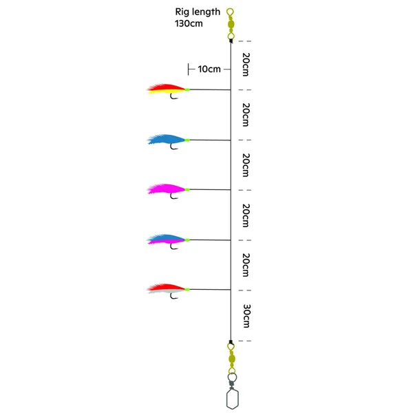 Das Feather Rig Rig besitzt ein Dekor aus Federn mit reflektierenden Elementen, die schnell für Aufmerksamkeit sorgen. Die gewählten Hakengrößen sind ideal zum Fischen auf Makrelen, Dorschen und Hornhechten. Auch Heringe finden oftmals den Weg zum Köder. Bringen Sie diese Meeresvorfächer in der Ostsee, in der Nordsee oder auch in Norwegen zum Einsatz indem das fertige Vorfach an die Hauptschnur angeködert wird und am unteren Ende mit einem großen Blei oder einem Pilker das nötige Sinkverhalten gibt.