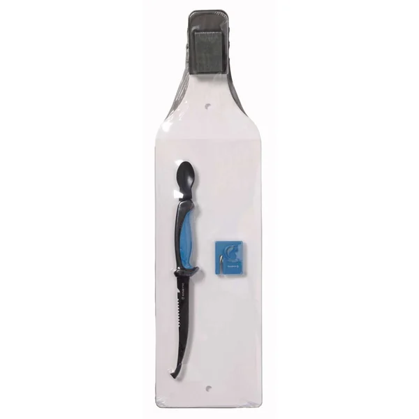 Rasiermesserscharfes 6,5″ Filetiermesser, Schneidebrett und Messerschärfer. Das Filetiermesser ist mit einem starren Löffelwerkzeug zum Entfernen der Nierenstränge ausgestattet.