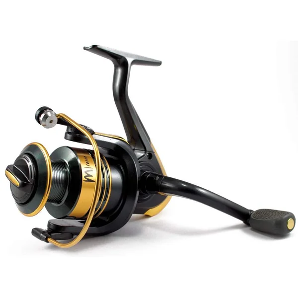 Der dicke Schnurfangbügel der M-Force ist mit einer Longlife Bügelfeder versehen und weist ein extra großes Schnurlaufröllchen auf. Die Kurbel kann für Links- bzw. Rechtshandbetrieb umgesteckt werden. Eine unendliche Rücklaufsperre verhindert im Drill sicher Auch optisch macht die M-Force Stationärrolle was her. Mit matt schwarzen Körper und goldfarbenen Akzenten an Spule, Schnurfangbügel und unterem Rollenkörper ist sie ein Blickfang an der Rute. Die Rolle gib es in zwei Ausführungen. Eine 2500er mit 240m/0,20mm und eine 4000er mit 200m/0,30mm Schnurfassung.