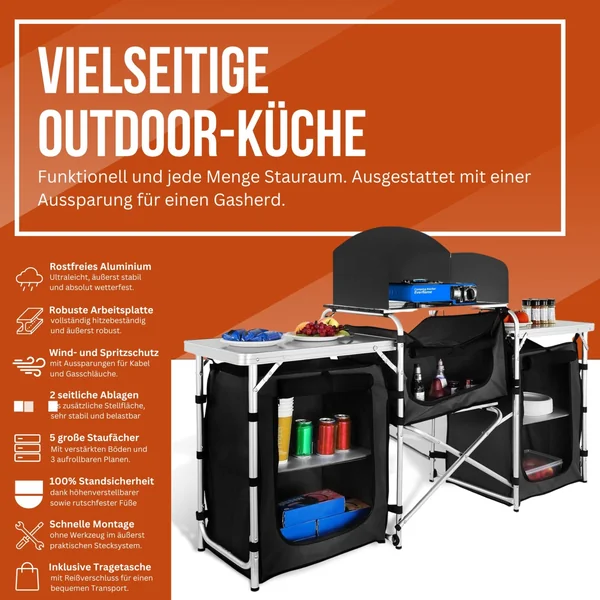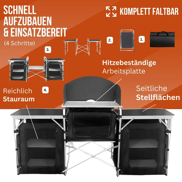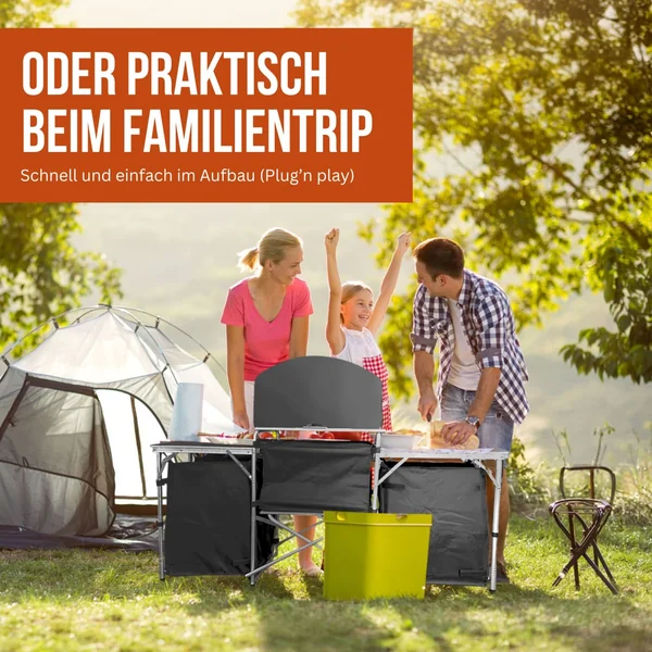 Mit der Nayver Campingküche wird jede Mahlzeit im Freien zu einem Highlight. Sie ist ideal für Camping, Grillpartys und spontane Ausflüge. Die Küche besticht durch ihr durchdachtes Design und ihre Funktionalität, sodass Sie in jeder Umgebung kochen können – ob auf dem Campingplatz, im Garten oder beim Picknick.