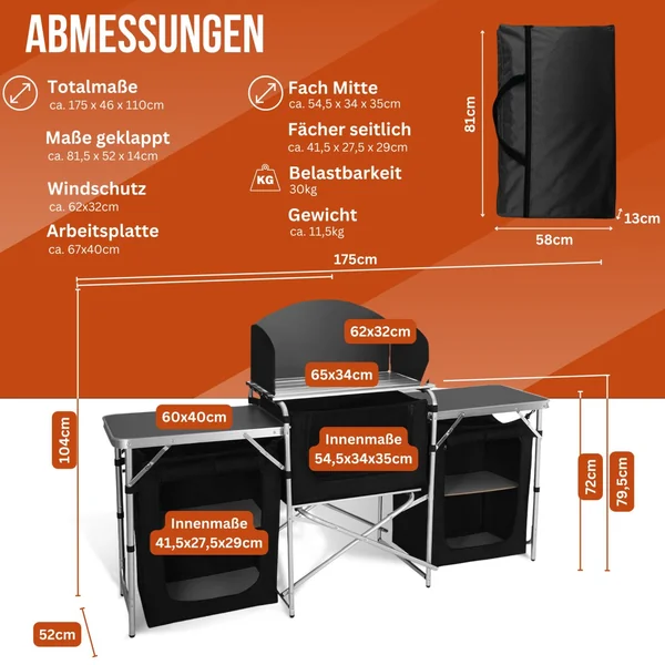 Mit drei geräumigen Reißverschluss-Stoffschränken bietet die Campingküche reichlich Platz für alle notwendigen Küchenutensilien. Die beiden äußeren Schränke sind mit stabilen Regalböden ausgestattet, die zusätzlichen Stauraum bieten und Ordnung schaffen. Ihre Kompaktheit und der einfache Aufbau machen diese Küche zu einem praktischen Begleiter auf allen Abenteuern.