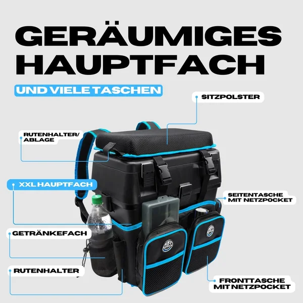 Rund um das System befinden sich drei geräumige Reißverschlusstaschen, die ideal für Tackle, Werkzeug, Snacks oder sonstige Ausrüstung geeignet sind. Die Meshnetze an der Front schaffen zusätzlichen Stauraum für schnell griffbereite Utensilien. Außerdem verfügt die Kiepe über einen Trinkflaschenhalter mit Kordelzug sowie eine Rutentasche, die in Verbindung mit dem Klettverschluss an der Sitzfläche deine Rute sicher aufnimmt – ideal, wenn du z.?B. mit dem Fahrrad zum Wasser fährst.