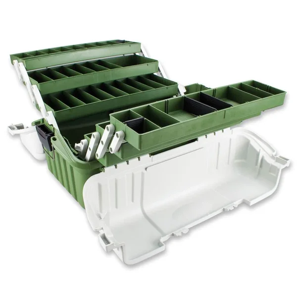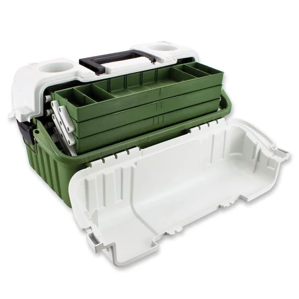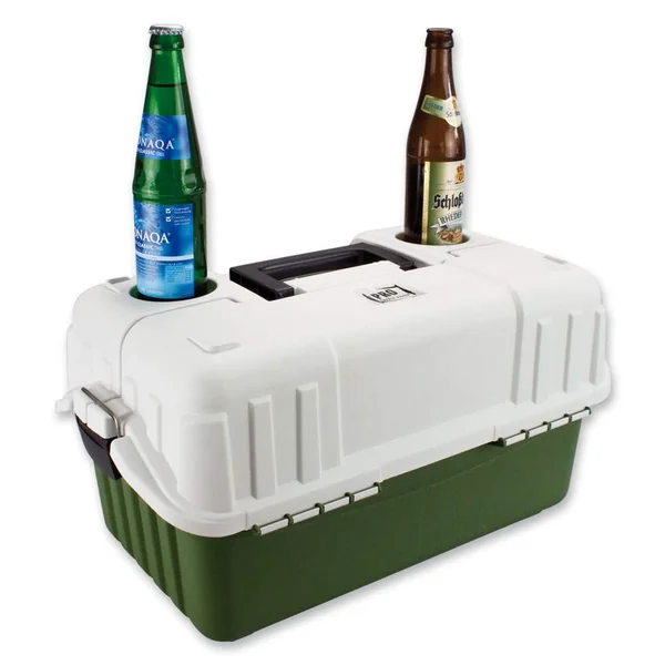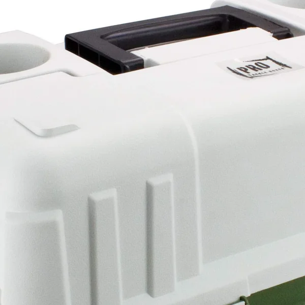 Dieser Angelkoffer wird mittels praktischer Schnappverschlüsse geschlossen gehalten. Die Pro Tackle Gerätebox 8616 ist aus stabilem und schlagfestem Kunststoff hergestellt. Die beiden Deckelteile sowie der Deckel zum Unterteil hin werden mit einer Wulst verschlossen was Wasser und Schmutz vom Inneren fern hält. Der Tragegriff ist besonders breit und die Gerätebox lässt sich so angenehm tragen. Auf der Box sind noch 2 runde Aussparungen, in der z.B. Madendosen untergebracht werden können. Alternativ lassen sich diese auch als Getränkehalter verwenden.