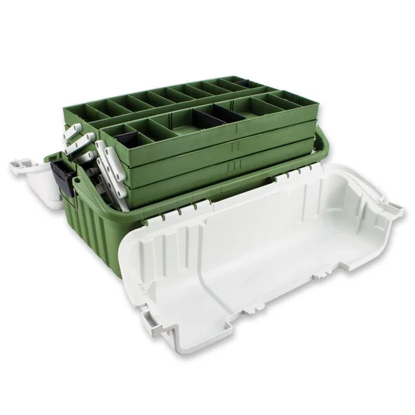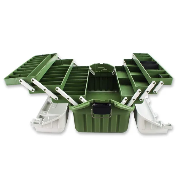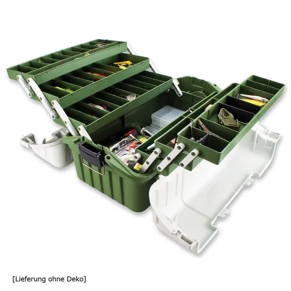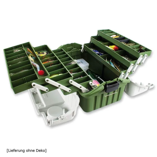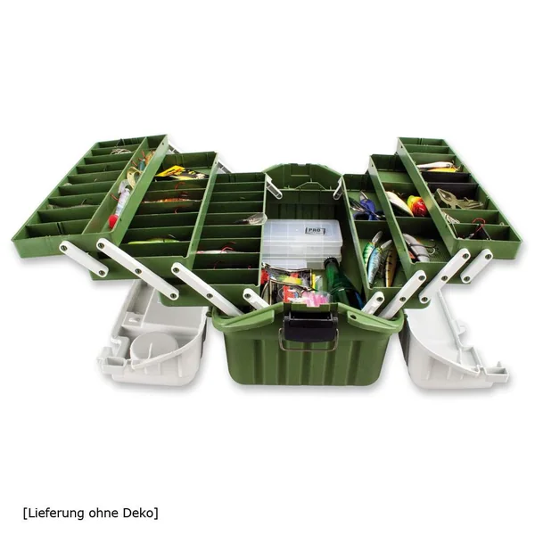 Die Pro Tackle Gerätebox 8616 ist ein typischer Angelkoffer im Werkzeugkofferprinzip. Der Deckel kann zu 2 Seiten aufgeklappt werden und die 6 Läden werden an Schanieren auseinander gezogen. In diesen Läden stehen Ihnen 36 Fächer zur Verfügung um Kleinteile unter zu bringen und zu sortieren. 5 dieser Fächer können Sie sich selbst mit Trennern so einteilen, wie Sie es benötigen. Diese Trenner bekommen Sie natürlich mitgeliefert. Das größere Angelzubehör sowie Werkzeug usw. können dann in der großen Hauptkammer am Boden abgelegt werden. So steht Ihnen jede Menge Stauraum zu Verfügung, dass nicht nur Übersichtlich sortiert, sondern auch schnell zur Hand ist.