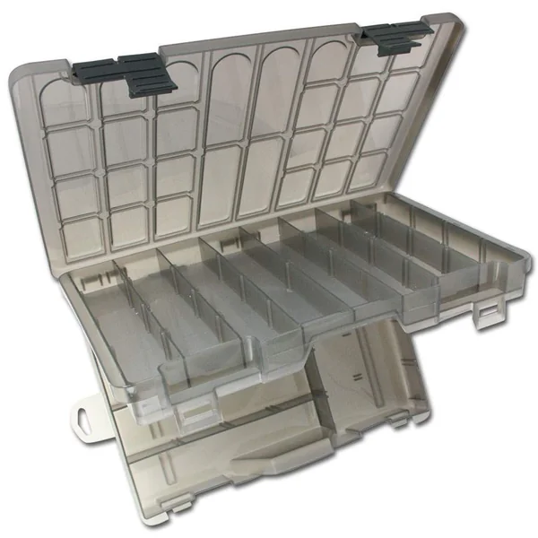 Die Pro Tackle Gerätebox 4750 besteht aus 2 separaten Fächern, die untereinander liegen. Mit dem großen Frontverschluss wird die obere Box mit 25mm Tiefe geöffnet. mit den etwas schmaleren anliegenden Öffnern dann die untere mit 35mm Tiefe. Diese Gerätebox ist für vielerlei Equipment geeignet, sei es für Posen, Kunstköder, Wirbel/Haken etc. Die einzelnen Fächer können nach Bedarf nochmal mit den 18 kleinen Trennern für die obere Box sowie 9 größere und 3 lange für die unteren Einteilungen.