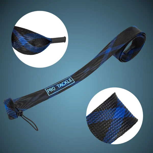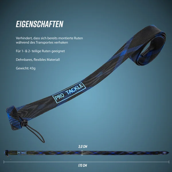 Die Rutensocke ist 170cm lang und eignet sich ideal für Ruten bis ca. 2,30m (einteilig). Inklusive ist eine Krokodils-Klemme am Gummi um die Rutensocke an einer Rolle zu befestigen. Die Rutensocke schützt Ihre Ruten perfekt vor Kratzern & Beschädigungen. Beim Transport im Auto oder Boot können sich bereits montierte Ruten nicht mehr verhaken oder gegenseitig beschädigen. Der Geflechtsschlauch ist luftdurchlässig, so das die Feuchtigkeit verdunstet.