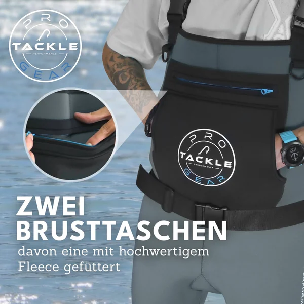 Für zusätzlichen Komfort ist die Waters Strider II mit zwei funktionalen Brusttaschen ausgestattet. Eine der Taschen ist mit Fleece gefüttert und bietet so eine angenehme Handwärmefunktion – ein besonders wertvolles Detail an kalten Tagen. Direkt darunter befindet sich eine weitere Brusttasche, die mit einem wasserfesten Reißverschluss versehen ist, um Wertsachen und empfindliches Zubehör sicher aufzubewahren. Die Brusttasche ist mit dem Pro Tackle Logo versehen und auf der linken Hüfte prangt das Logo „Performance Gear“ als Zeichen für Qualität und Funktionalität.
