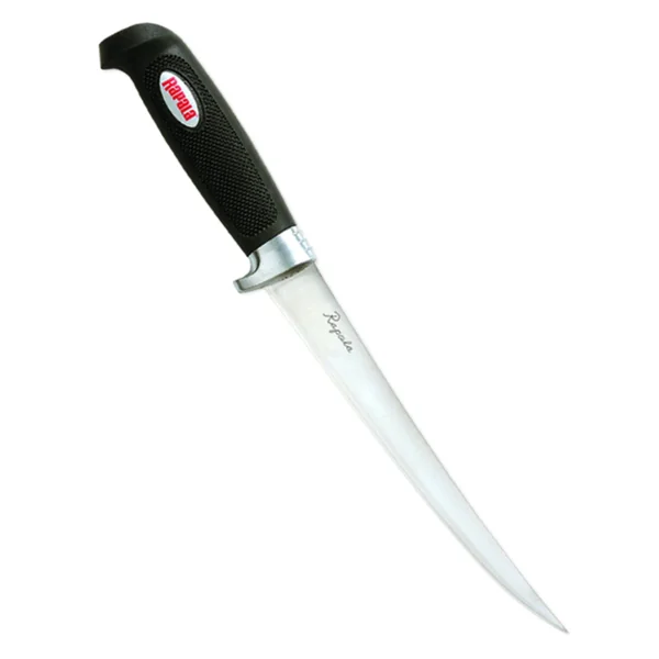 Die berühmte flexible Rapala-Klinge mit rutschfestem, weichem Griff für komfortables Filetieren. Vergrößerter Fingerschutz für zusätzliche Sicherheit. Wird komplett mit abgestimmter schwarzer, strukturierter Scheide geliefert. Inklusive einstufigem Schärfer.