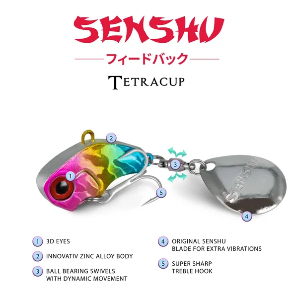 Der Tetracup ist ein kleiner Tail Spinner, mit dem man schnell und effektiv große Wasserflächen absuchen kann. Klein und richtig schwer für seine Größe, lässt er sich sehr weit und gezielt werfen. Schnell oder langsam eingeholt, Jojo-Style, der Tetracup ist immer sehr einfach zu fischen. Das metallene Vorderteil vibriert intensiv beim Einkurbeln. Das unterscheidet den Tetracup von anderen Ködern dieser Art. Zielfische sind Barsch, Rapfen, Döbel, Forellen und auch Zander.