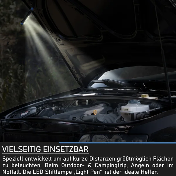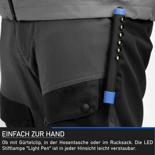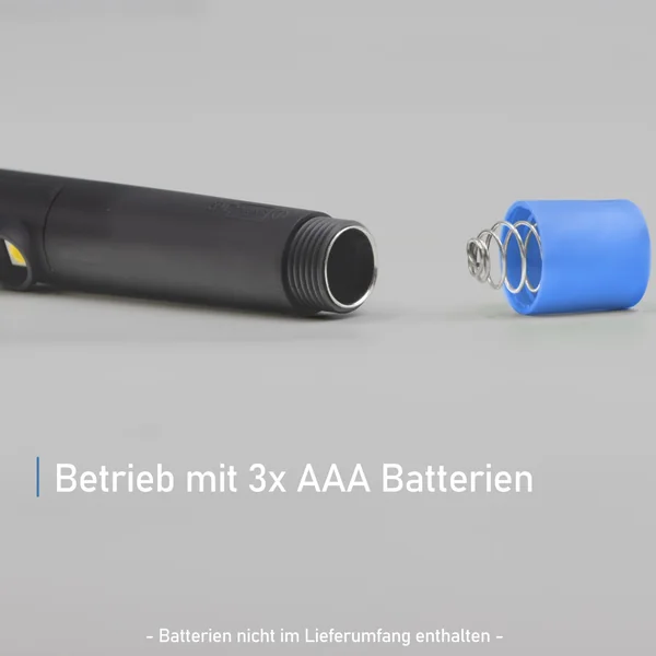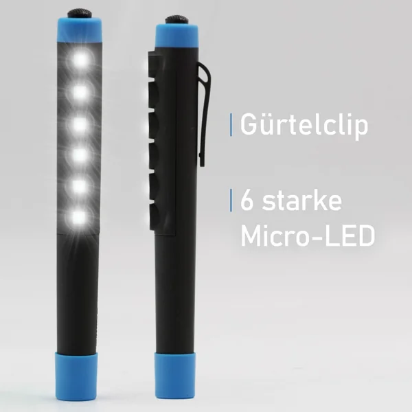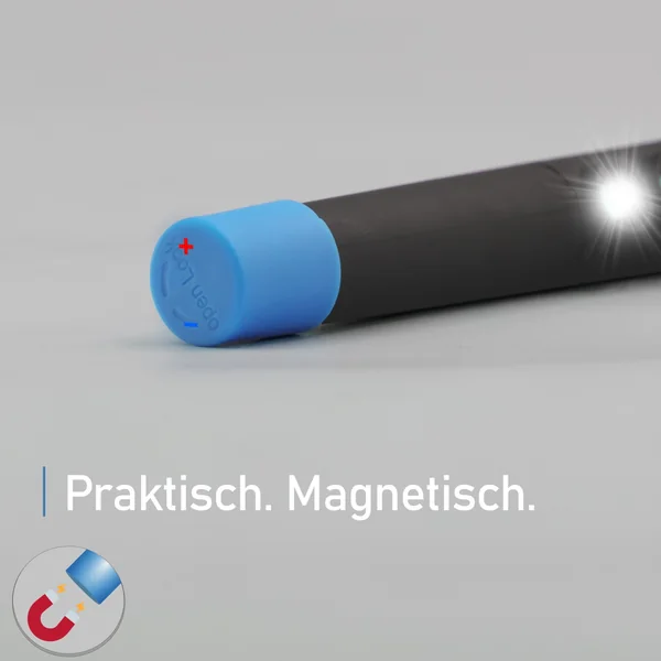 Die praktische Stiftlampe verfügt über einen Gürtelclip und einen Magneten mit dem die Lampe auf metallischen Oberflächen platziert oder gehangen werden kann.