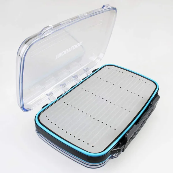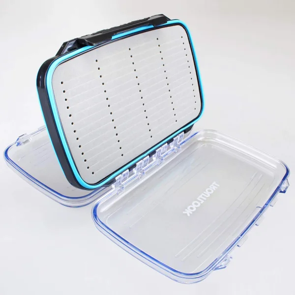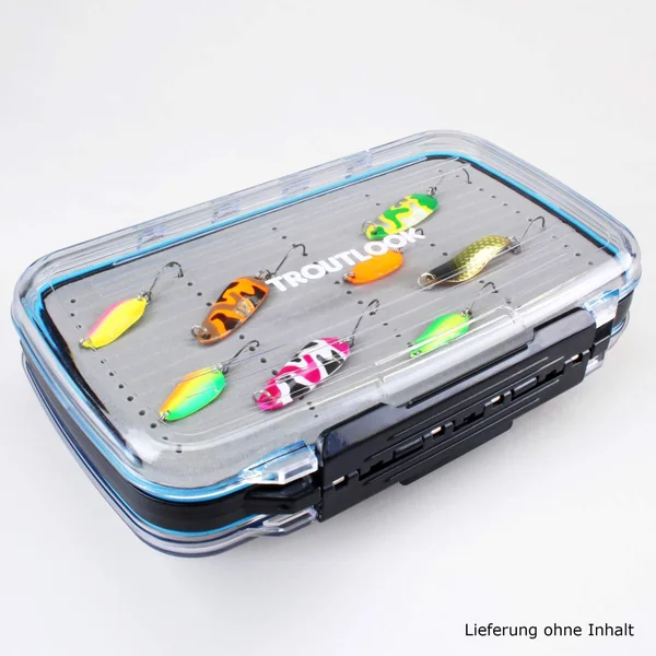 Die Forellenblinkerbox von Troutlook ist beidseitig verwendbar. Auf jeder Seite finden Sie ein identisch aufgebautes Fach mit transparenten Deckeln. Die Deckel sind mit einer weichen Dichtung ausgestattet, die die Box wasserdicht verschließt.