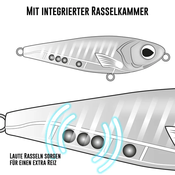 Ein äußerst erfolgreicher, doch oft unterschätzter Köder. Der Pike Glider überzeugt mit den gleichen Eigenschaften, wie große Stickbaits. Er flank seitlich weit aus, oder bei schnellerer Köderführung läuft er schnell „Walk the Dog“ und produziert manchmal Bisse im Minutentakt. Mit seinen super scharfen Drillingen werden sie viele Bisse verwerten können.