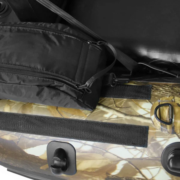 Seitliche Scheuerleisten verhindern Schrammspuren an der Aussenhaut, wenn das Belly Boat ins Wasser gelassen bzw. entnommen wird. Zum Tragen stehen am Camoura Angelboot drei große Tragegriffe zur Verfügung. D-Ringe auf der Unterseite laden auch dazu ein es mit Gurten wie ein Rucksack zu tragen.