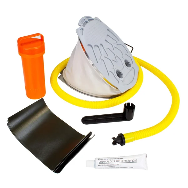 Das Waterside Camoura Float Pro wird zusammen mit einer Tragetasche, einer Fuß-Luftpumpe, einem Ventilschlüssel und einem Raparaturset geliefert.