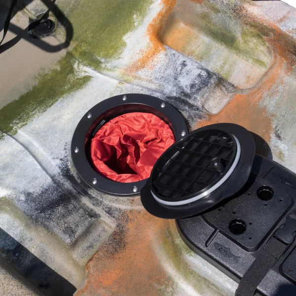 Das Fishman Kajak verfügt direkt vor dem Sitz über eine Stauluke und der Mittelkonsole – die primären Zugriffe für den Kajakfahrer. Direkt seitlich von Sitz sind zwei Spannhalter vorhanden, an denen das Paddel, ein Kescher oder auch eine gerade nicht benutzte Rute Paltz findet.