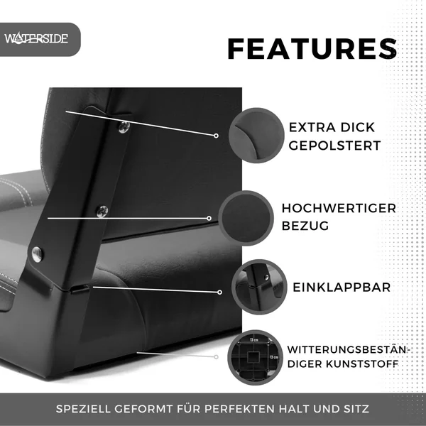 Der Waterside Luxus Bootssitz Highback ist ein extra dick gepolsterter Profi Bootssitz mit hoher Lehne und ausgestalteten Sitzmulden für guten Sitzkomfort und eine hohe Sitzfestigkeit. Die Bodenplatte ist aus leichten, stabilen und 100% witterungsbeständigem Kunststoff. Der Bezug besteht aus einem pflegeleichten und Wasser abweisenden Kunstleder, das optisch modern und aufwändig verarbeitet wurde. Durch die Polsterform ist langes Fischen kein Problem, denn der Sitzkomfort wird stets erhalten.