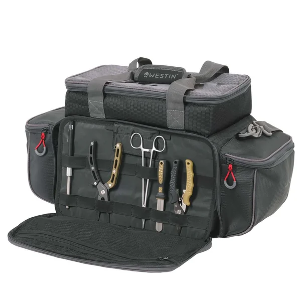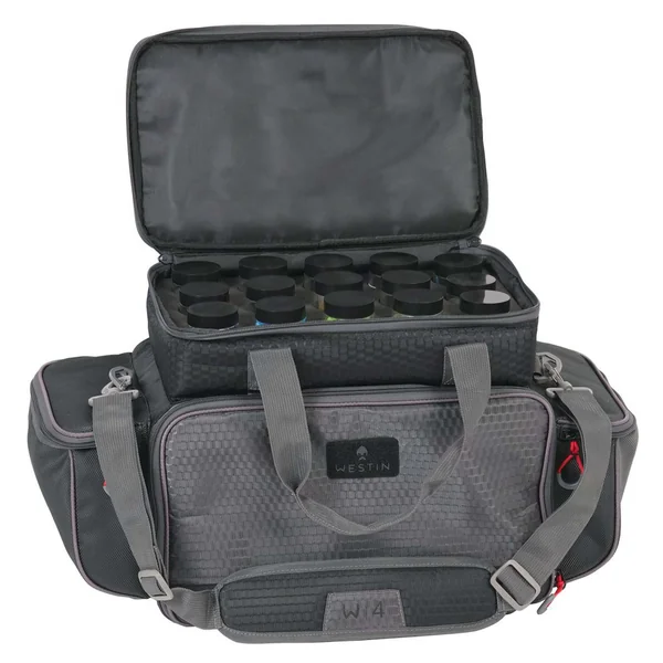 Die W4 P&T Master Bag ist die perfekte Lösung, um deine gesamte Ausrüstung zu organisieren. Das Hauptfach enthält fünf Westin Tackle Boxen, während das obere Fach Forellenteigdosen und Köder in einem EVA-Schaumstoffhalter aufnimmt. Das Werkzeug ist in der vorderen Werkzeugablage griffbereit. In den Seitentaschen hast du dein gesamtes Zubehör immer griffbereit. Mit wasserabweisenden Materialien, einem Tragegriff und einem abnehmbaren gepolsterten Schultergurt schützt die W4 P&T Master Bag deine gesamte Ausrüstung.